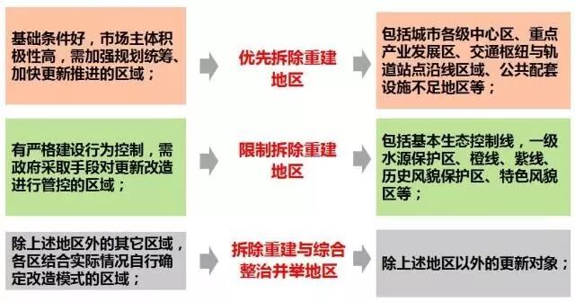 强化更新分区管控:按照提升民生幸福、加快中心地区发展、保障基础设施、维护公共安全的划定原则,将全市更新对象进行分区: